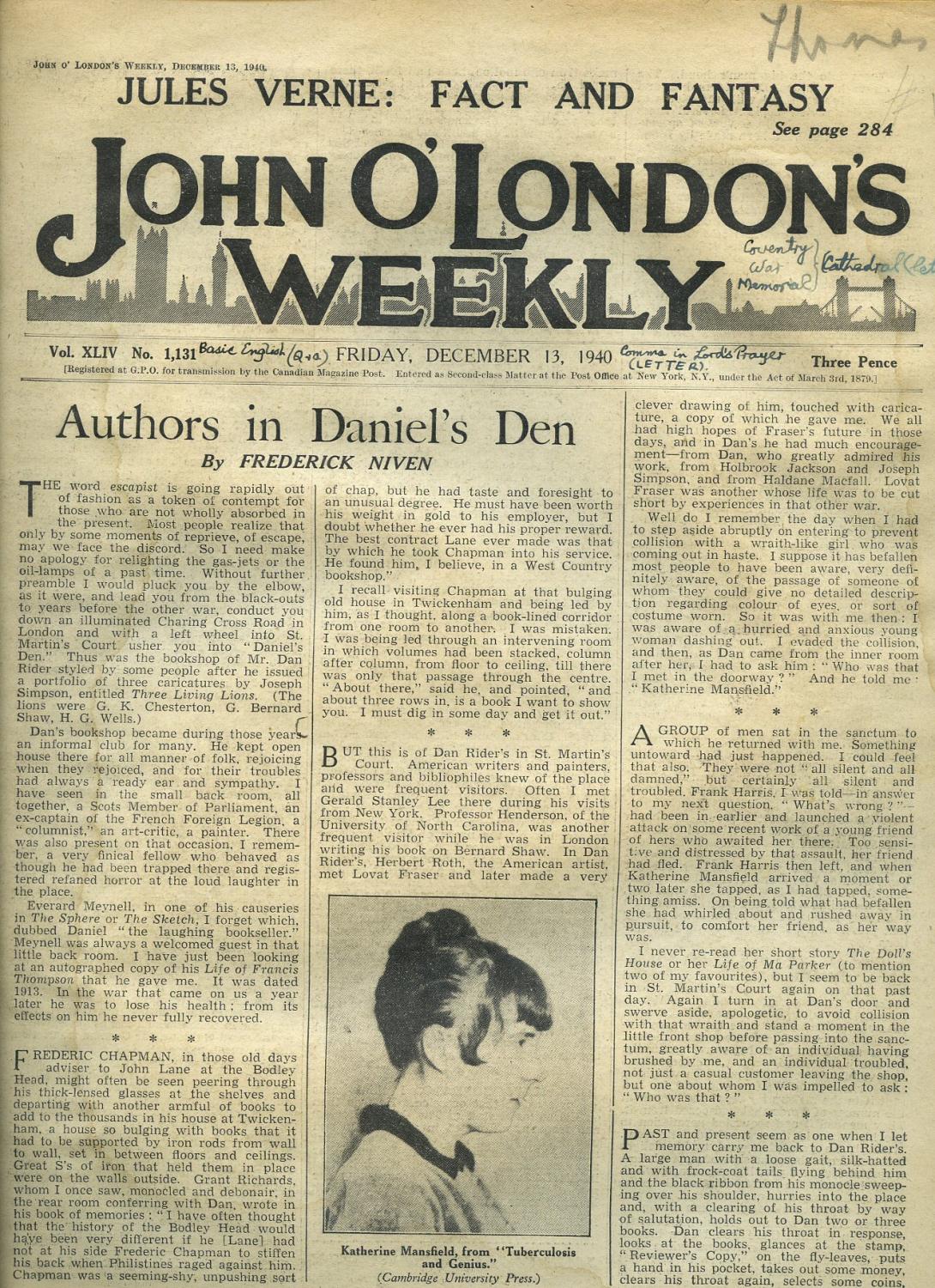 Book Review to the periodical 'John O'London's Weekly' Vol. XLIV No. 1131. December 13th 1940.