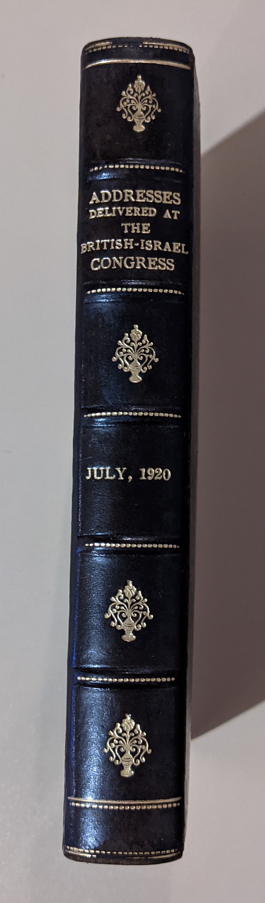 British-Israel-World Federation Congress; July 5th to 10th, 1920; Marshall Brothers, Ltd., 2 Crane Court, Fleet St., E.C.4, London. From the Preface The Inaugural Meeting of the Federation took place on July 3rd, 1919, so that the Federation had been in operation just one year. Just when this Movement began, it is difficult to say with exactitude, but it may certainly be stated that it was publicly proclaimed in the British House of Commons by one of the members thereof in the 17th century; and by Dean Abbadie in the 18th century. It is believed that the first two books on the subject were published in London in 1814 and 1816. Space does not permit us giving the names of hundreds of veterans and stalwarts who have taught it during the past 70 years or so, but among them we must certainly mention the late Earl of Radnor and Bishop Titcomb. And among those still with us are the Countess-Dowager of Radnor; the Earl of Dysart; and Sir Merton Russell-Cotes. It is owing to the continuous and devoted labours of these, and thousands of others, that the holding of the Congress has been made possible and have aroused an enormous amount of interest and enquiry through the British Empire and America. From our friends at Wikipedia - The British-Israel-World Federation, also known as the British-Israel World Federation was founded in London on 3 July 1919, although its roots can be traced back to the 19th century. The main patron of this movement was Princess Alice, Countess of Athlone. She attended the federation's first Congress in July 1920, and remained a patron of the BIWF until her death in 1981. William Pascoe Goard was involved in early negotiations of developing the BIWF and became vice president of the organization in 1921. In 1922, Goard founded Covenant Publishing, the BIWF's publishing company. He also became the first editor of The National Message. The National Message was published until 1981. The federation now publishes The Covenant Nations magazine. British Israelism (also called Anglo-Israelism) states that people of Western Europe descent, particularly those in Great Britain, are the direct lineal descendants of the Ten Lost Tribes of Israel. The doctrine often includes the tenet that the British Royal Family is directly descended from the line of King David. The British-Israel-World Federation, with its headquarters in the United Kingdom, has expanded to Australia, Canada, New Zealand, South Africa and the Netherlands. Throughout the years, this organization enjoyed the patronage of members of the British establishment including The Duke of Buccleuch; Lord Gisborough; William Massey, Prime Minister of New Zealand; John Charles Montagu Douglas Scott, the Duke of Buccleuch; Lord Moubray St John of Bletso; The Countess-Dowager of Castlestewart; and Lady Smith Dodsworth. This book, the report of the seminal 1920 conference, 290 pages plus info and a Form of Bequest template, is in fine condition. It is half-bound in leather with marbled boards and endpapers, and all edges gilt. Whoever has this report bound spared no expense it is magnificent. Not enough to degrade its condition, it should be pointed out that a 3mm portion of the top spine edge gilt has worn away and the same at the bottom. At the time of this posting on the internet no other copies were listed. This is extremely rare, extremely important to the movement that exists today, and in unbelievable condition. N° de réf. du vendeur 2111c