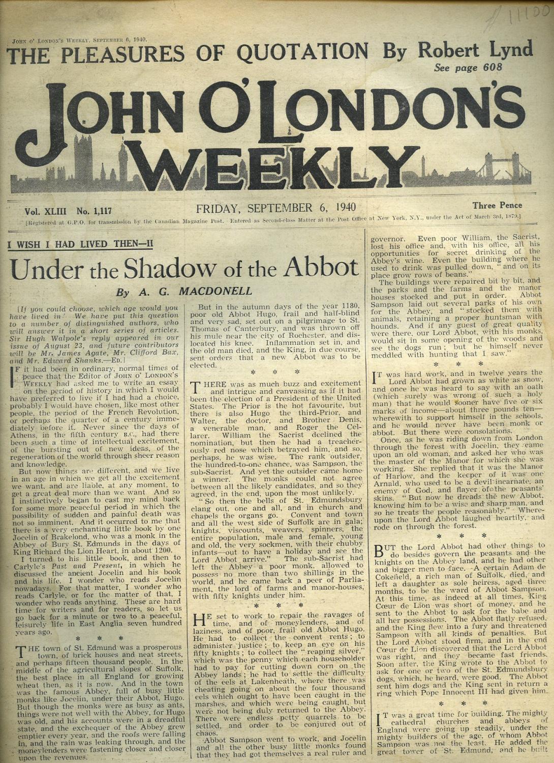 Bates, H. E. [1906-1974] Contributes: [John O'London's Weekly]