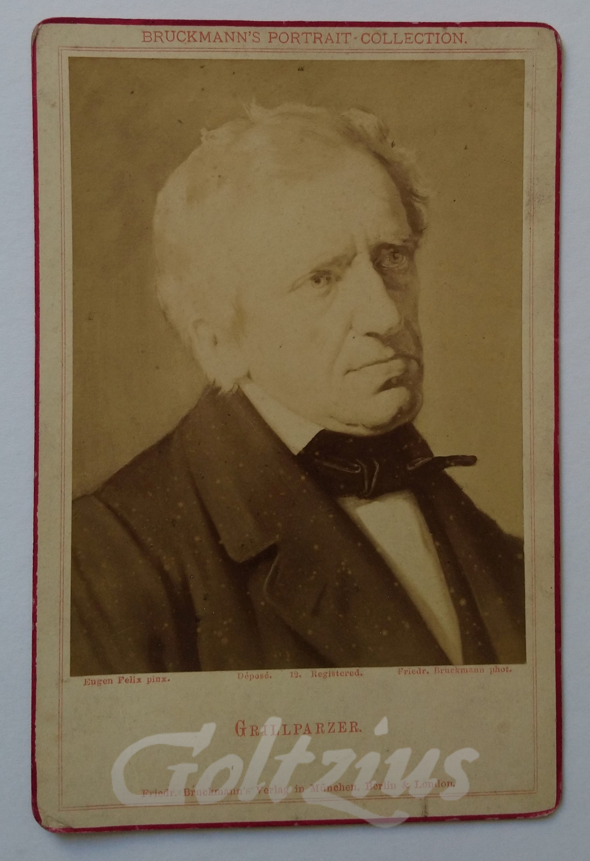 Ajouter au panierPhotographic reproduction of a painted portrait of Franz Seraphicus Grillparzer. Grillparzer (1791-1872) was an Austrian author, considered to be the leading Austrian dramatist of the 19th century. His plays were and are frequently performed at the famous Burgtheater in Vienna. He also wrote the oration for Ludwig van Beethoven's funeral, as well as the epitaph for his friend Franz Schubert (source: Wikipedia). Albumen print on thick card, cabinet card, size 171 x 113 mm., photograph size 130 x 98 mm. Photograph by Friedrich Bruckmann, after the painting by Eugen Felix. Published by Friedrich Bruckmann's Verlag (Munich, Berlin & London), c. 1880. Friedrich Bruckmann (1814-1898) was a German publisher and photographer who specialized in artistic photography. Eugen Felix (1836-1906) was an Austrian painter. He started his studies with Ferdinand Georg Waldmüller and continued in Paris with Léon Cogniet. Felix is particularly well known for his portraits, but he also painted mythological and historical scenes. In good condition, a small crease in the lower left of the photograph. Scattered silvery spots (the natural aging of this photographic medium).