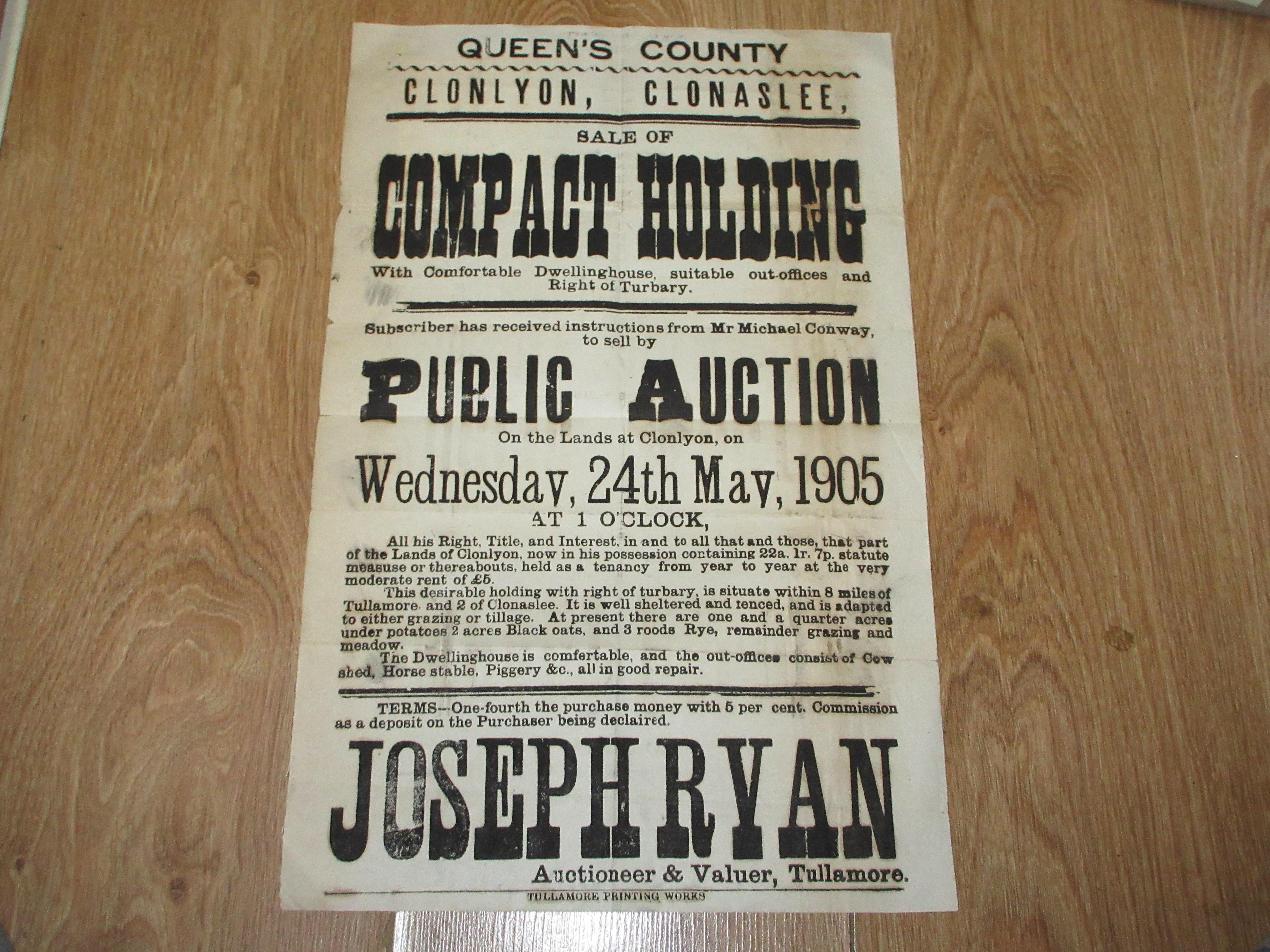 Laois Interest: Queen's County Clonlyon, Clonaslee, Sale of Compact Building by Public Auction Wednesday 24th May, 1905. Contains 22 acres. 1 Road & 7 Perches