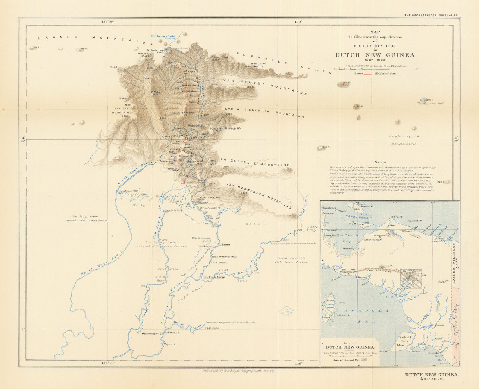 Map to illustrate the expeditions of H. A. Lorentz LL.D. in Dutch New Guinea, 1907-1909