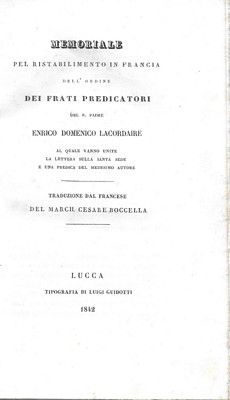 Memorie pel ristabilimento in Francia dell'ordine dei Predicatori, al quale vanno unite la lettera sulla santa sede e una predica del medesimo autore. Traduzione dal francese del March. Cesare Boccella.