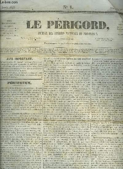LE PERIGORD JOURNAL DES INTERETS NATIONAUX ET PROVINCIAUX N°1 ANNEE 1843 - Périgueux - Fénélon - extérieur Espagne - Intérieur Paris - correspondance particulière du Périgord Paris le 29 décembre 1842 affaire Marcellange cour d'assises du Rhône etc.