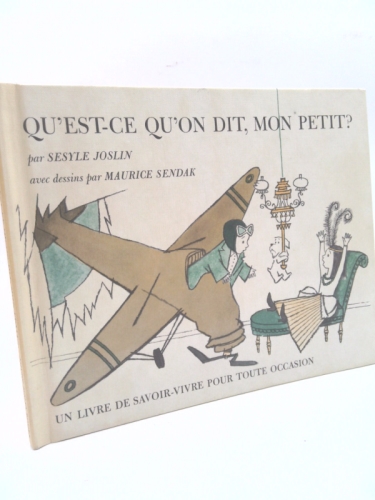 Hardcover. Etat : Very Good-. Etat de la jaquette : Good. Illustrated by Maurice Sendak (illustrateur). [48] p. 18 x 22.5 cm. oblong Sound and square reinforced library binding in illustrated boards. Slight musty smell. Light moisture stain on bottom fore-corner of upper board. Slight soil to the boards. Top edge of text block has light foxing. The endpapers have a few speckles of soil and there is a previous owner's name on the front free endpaper. Otherwise, the inside pages are clean and unmarked. Dust jacket has edge wear, including chips, and tiny tears and creases. Light soil to the panels and folds. Price clipped. A French translation of Sesyle Joslin's 1958 children's book "What Do You Say, Dear". Illustrated by Maurice Sendak. This book was a Caldecott Medal Honor winner when first published in English. N° de réf. du vendeur 6105