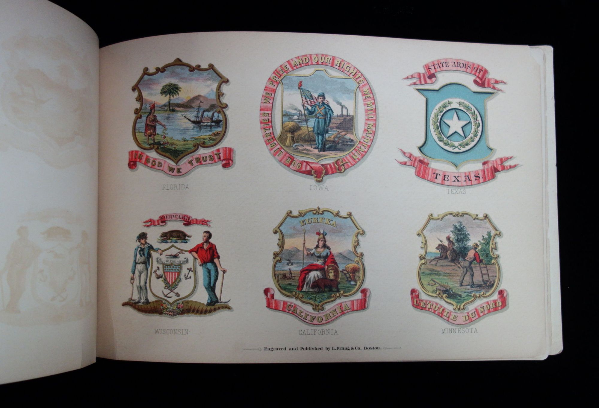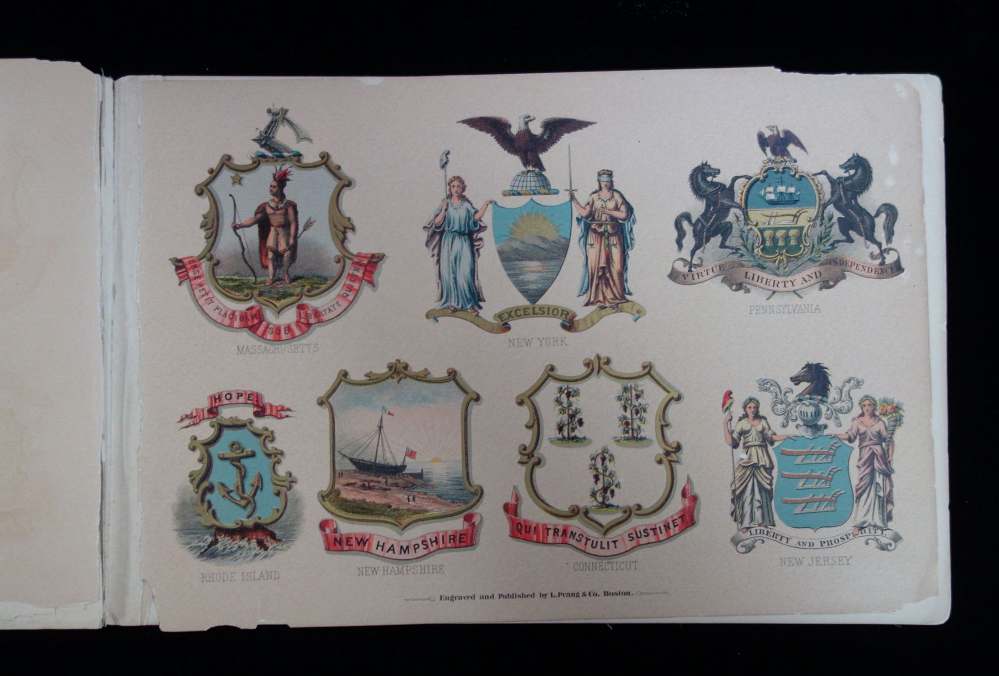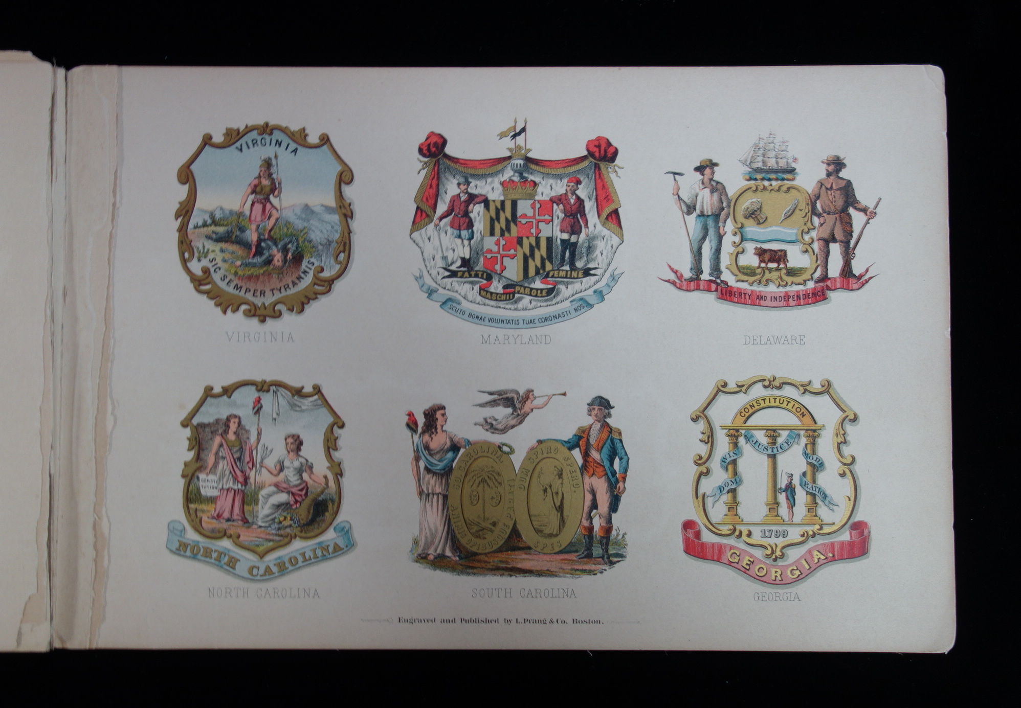 Manufacturer: L. Prang & Co. Location: Boston, MA Date: 1876 Pages: 10 (printed on single side) Subject Matter: Printers Cut Book, State Arms A printers cut book of the States' Coat of Arms. Each page has six coat of arms on it, engraved and gilded. The book was prepared with the assistance of Mr. H Mitchell, a heraldic designer and seal engraver in Boston. The original thirteen states seals were taken directly from paintings found in Independence Hall in Philadelphia, PA. The covers show moderate edge wear, along with toning and soiling. The top edge of the front cover is slightly bent and there is a small stain on the back cover. The first three pages are detached There is some staining on the backs of each page due to the deterioration of the ink used in the printing of the book. General toning and soiling throughout. 10 3/4" x 7". N° de réf. du vendeur 230068