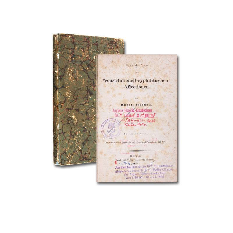 1 mehrf. gef. lith. Taf., (1 Bl.), 120 S. Lwd. d. Zt. mit RTit. Erste Einzelausgabe. - Garrison/Morton 2385; SGC I: XV, 765; Waller 10012; Proksch III, 435; Engelmann 264. - 'Virchow's great work on the pathology of syphilis confirmed the fact that it was a disease which involved all organs and tissues of the body and showed that the casual organism was transferred through the blood to the various organs and tissues.' (G/M). - Schwach gebräunt. Vorsatz, Titel und S. 9 gestempelt, vereinzelt An- und Unterstreichungen. N° de réf. du vendeur 10250AB