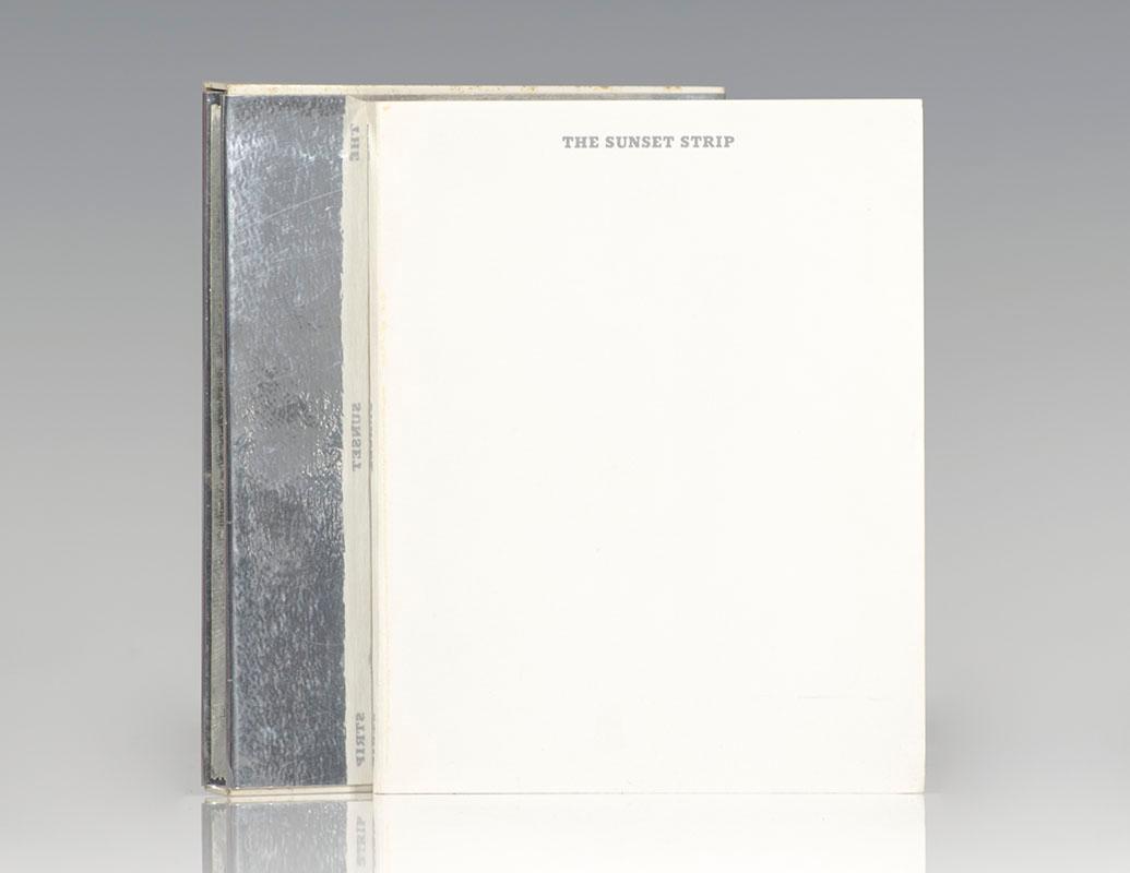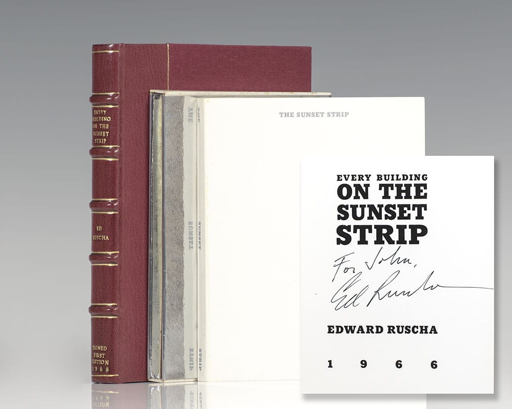 First edition, second issue. Small octavo, original stiff self-wrappers, original slipcase. Inscribed by the artist on the title page, "For John Ed Ruscha." One continuous accordion-fold page composed of glued paper segments with black-and-white photographs of every building on the sunset strip. Fine in a fine slipcase. Housed in a custom half morocco clamshell box. An exceptional example. In the 1960s, Ed Ruscha more or less reinvented the artist's book. By turning away from the craftsmanship and luxury status that typified the livre d'artiste in favor of the artistic idea or concept, expressed simply through photographs and text, Ruscha opened the genre to the possibilities of mass-production and distribution. The 27-foot length of the accordion-folded Every Building on the Sunset Strip affords the viewer two continuous photographic views of the mile and a half section of this landmark stretch of Sunset, one for each side of one of the city's landmark thoroughfare" (The Getty Research Institute). Roth 101; Parr & Badger, Photobook II. N° de réf. du libraire 93546