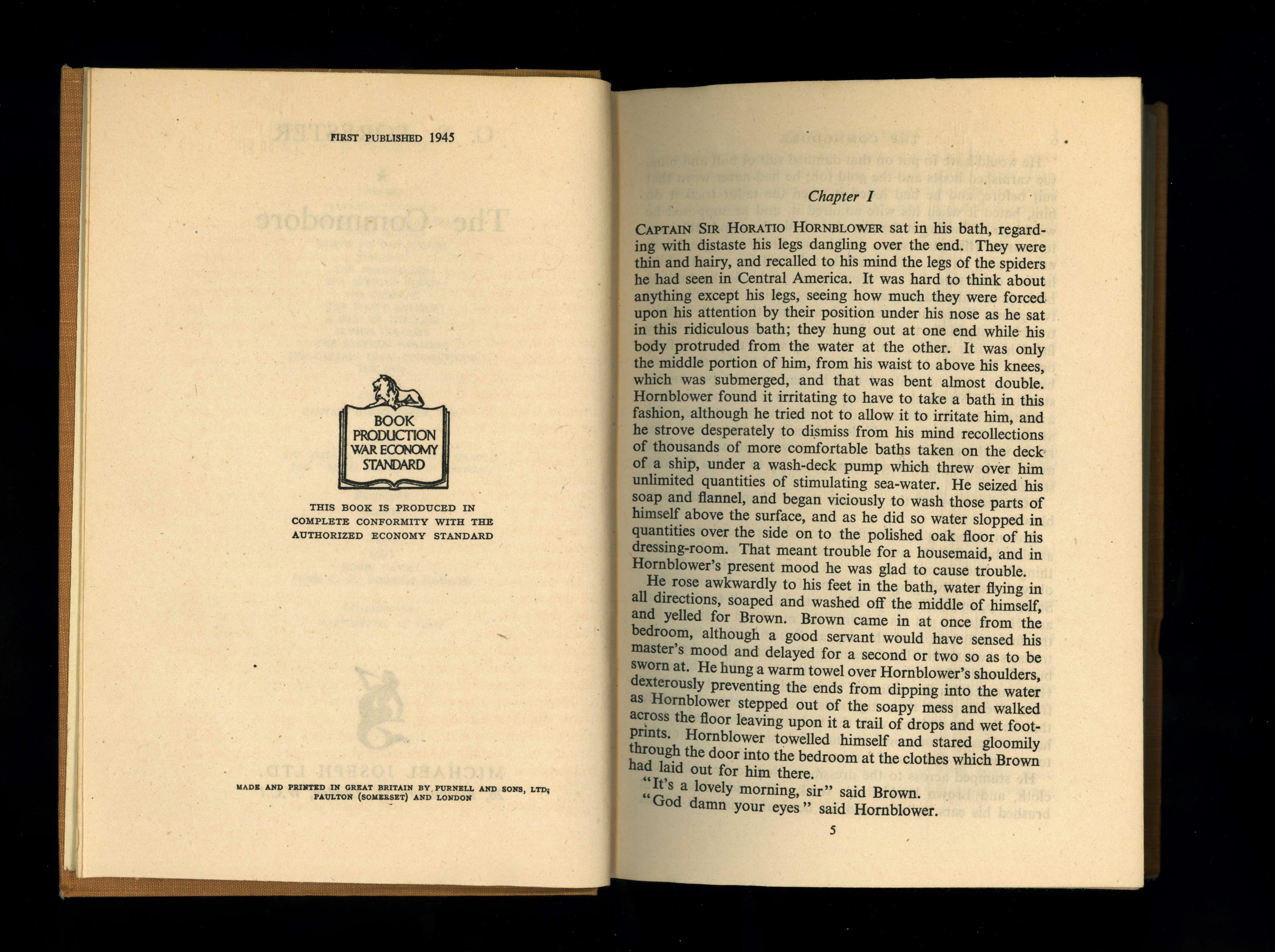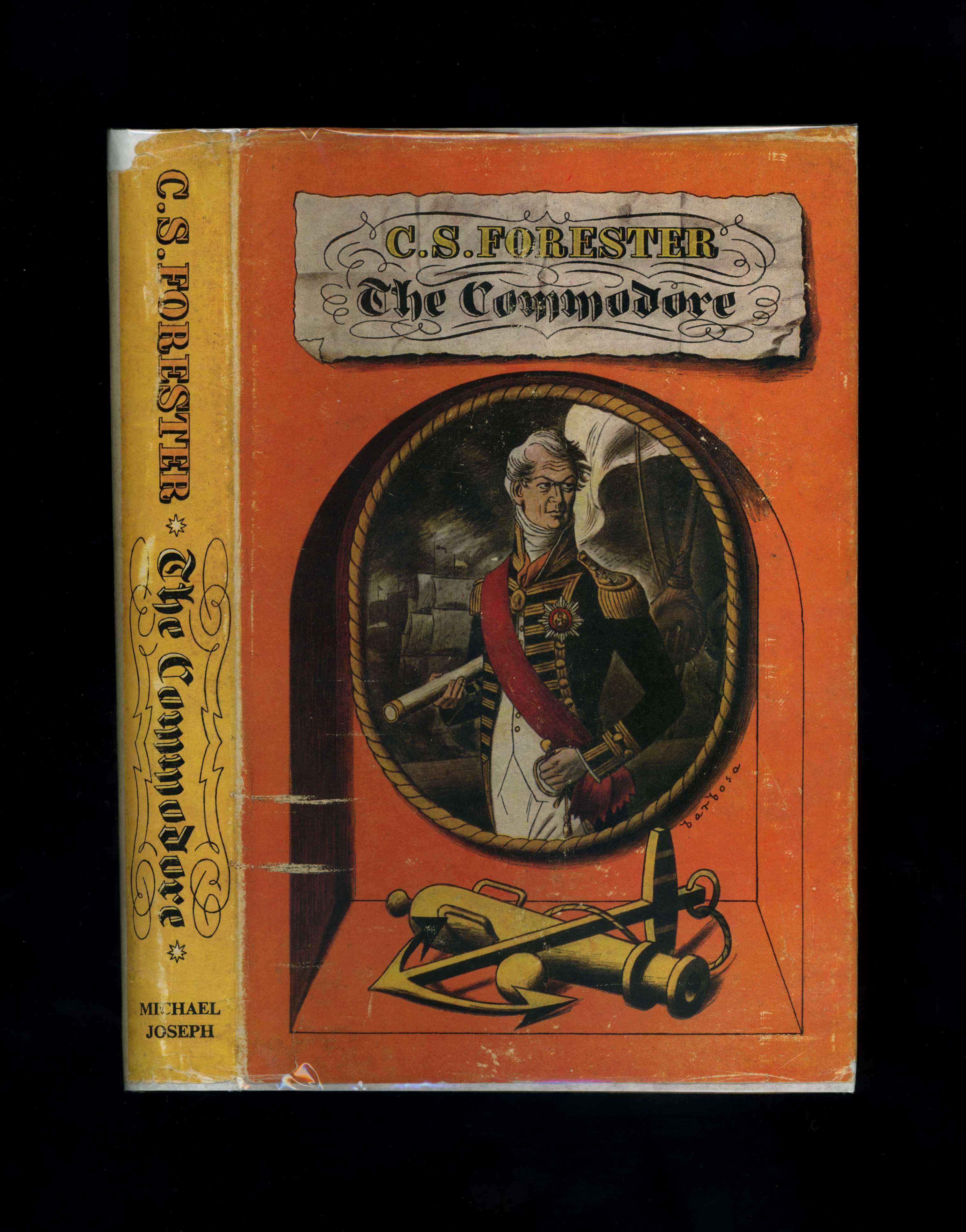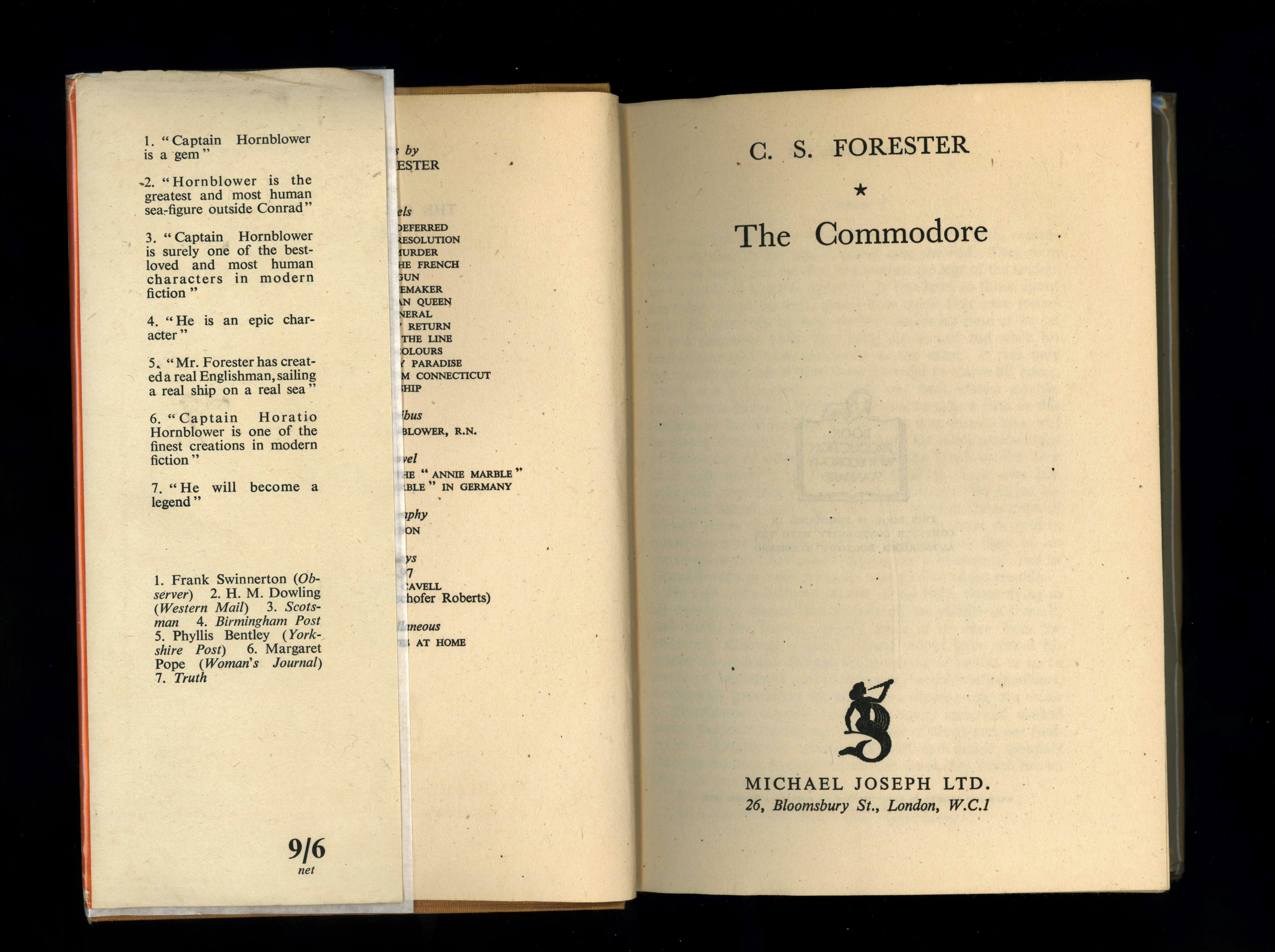 First impression of the true first edition. ***Very good in tan cloth covered boards with silver titles to the spine. The boards are clean and unmarked. Very light vertical reading crease to the spine. Thin boards very slightly creased at the edges. Edges of the page block are nice and clean. Internally near fine with no inscriptions or annotations. Thin War Economy paper used is uncreased. Spine tight. ***In a very good colour illustrated dustwrapper, which is not price-clipped, retaining the original publisher's printed price of 9/6 net. The dustwrapper is virtually complete, with just a small chip at the top of the spine. The dustwrapper is rubbed and creased at the edges with a few light areas of rubbing to the spine, which is also slightly faded. The back panel is unusually clean. Dustwrapper bright. ***190mm x 130mm. 271 pages. ***First impression of the true first edition of "The Commodore", a wartime Hornblower novel by C. S. Forester, in nice collectable condition. *** For all our books, postage is charged at cost, allowing for packaging: any shipping rates indicated on ABE are an average only: we will reduce the P & P charge where appropriate - please contact us for postal rates for heavier books and sets etc. N° de réf. du vendeur 8460