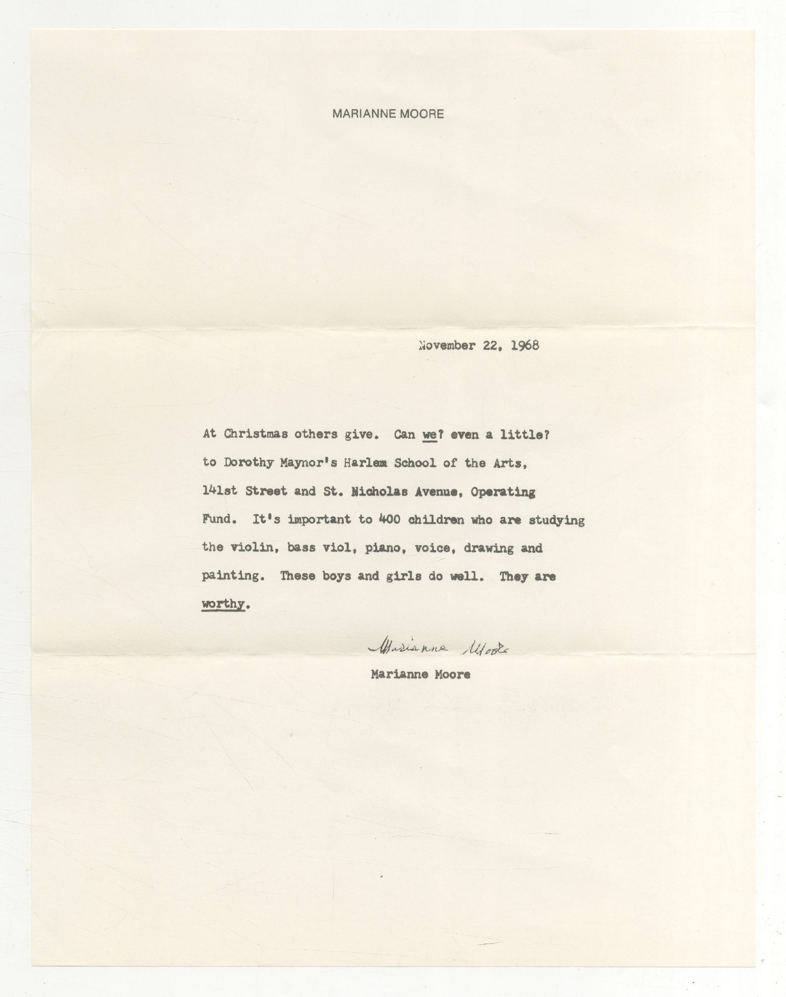 Form Letter Requesting Funds for Dorothy Maynor's Harlem School for the Arts